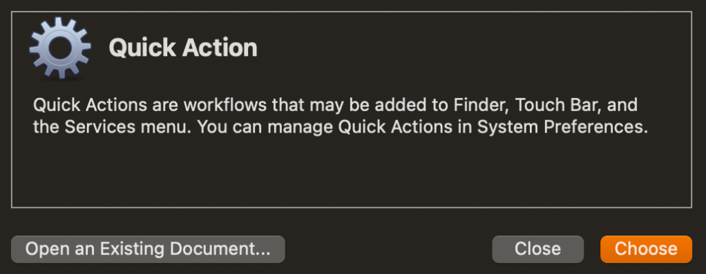 First, open Automator. Then select New document and create a Quick Action (in older versions it might be called Service).
