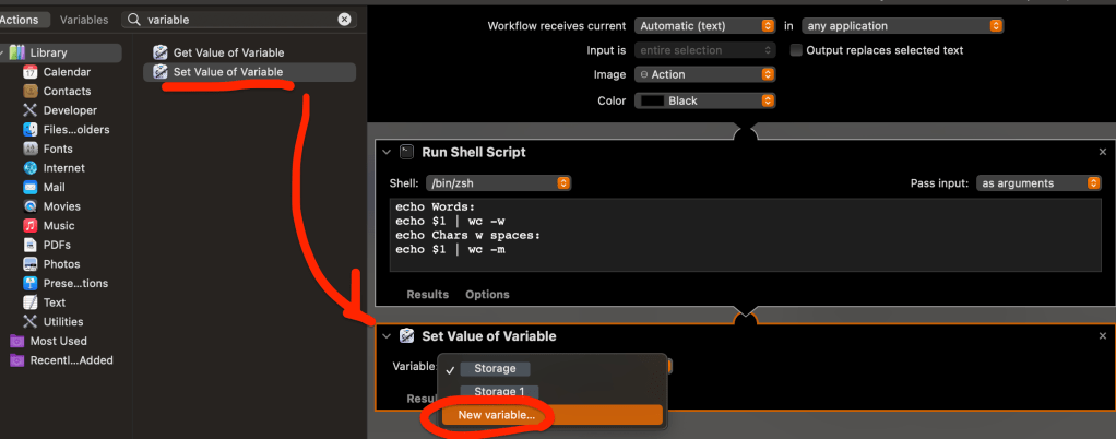 Go back to the list of actions and search for Set Value of Variable. Drag and drop it after the shell script action.