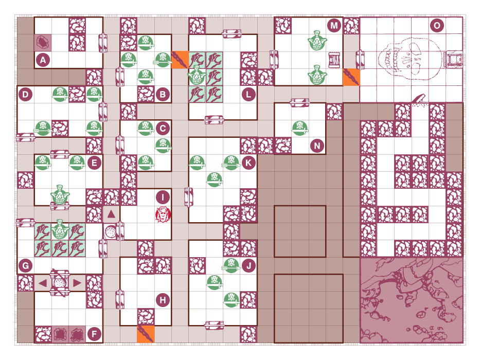The way out is down, unsurprisingly, but it comes with the territory of being a hero (for hire). If the heroes entered these caverns through the broken floor behind the locked door in part 1, they start part 2 in the room marked F. If the heroes entered through the hole behind the Gargoyle, they start in the room marked A (this path sucks more).